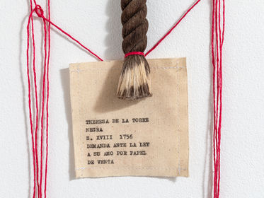 Escribimos sobre tela con máquina de escribir una breve descripción de las mujeres que acompañan a cada pieza textil. Por último, todas las piezas textiles están unidas por hilo de lino rojo que vincula a cada una de estas historias y les da una continuidad que no es lineal, sino cíclica. El acto de recordar es un constante renacer de la memoria, cada semilla recuerda su ciclo cuando es sembrada en tierra fértil.